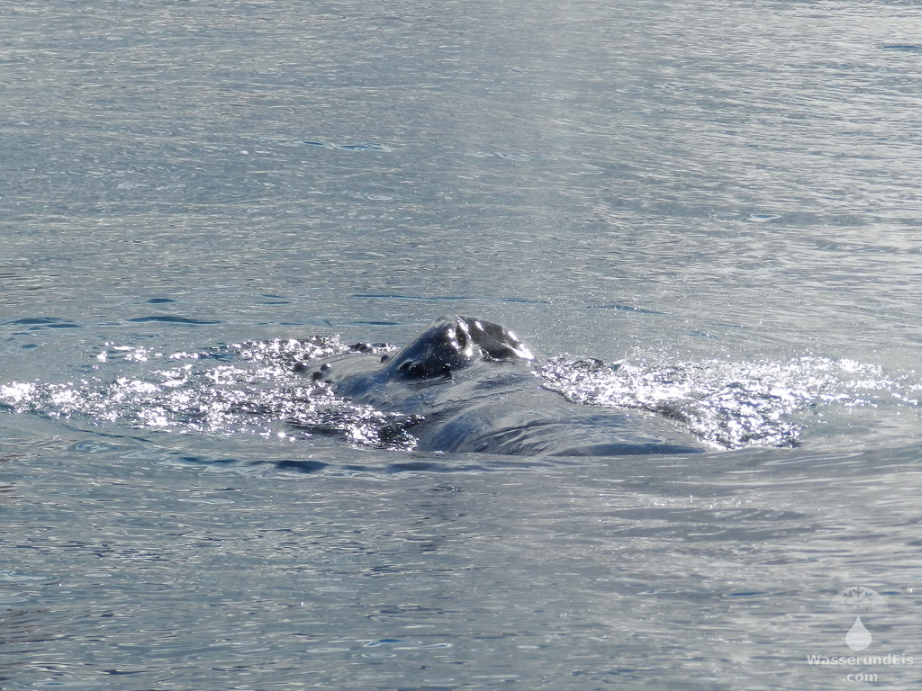 Blasender Buckelwal im Ozean vor Husavik auf Island.
