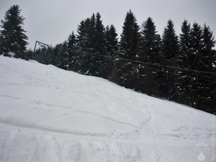 Obwohl ausreichend Schnee lag, etwas mehr als ein halber Meter, waren die Bedingungen nicht perfekt. Die Pisten waren zwar dick verpackt und gut präpariert durch die leichten Plusgrade wurde der Schnee jedoch etwas feucht und stumpf. Dazu war es stark bewölkt, die Bodensicht ausbaufähig – dafür war aber praktisch nichts los. Privatski sozusagen.