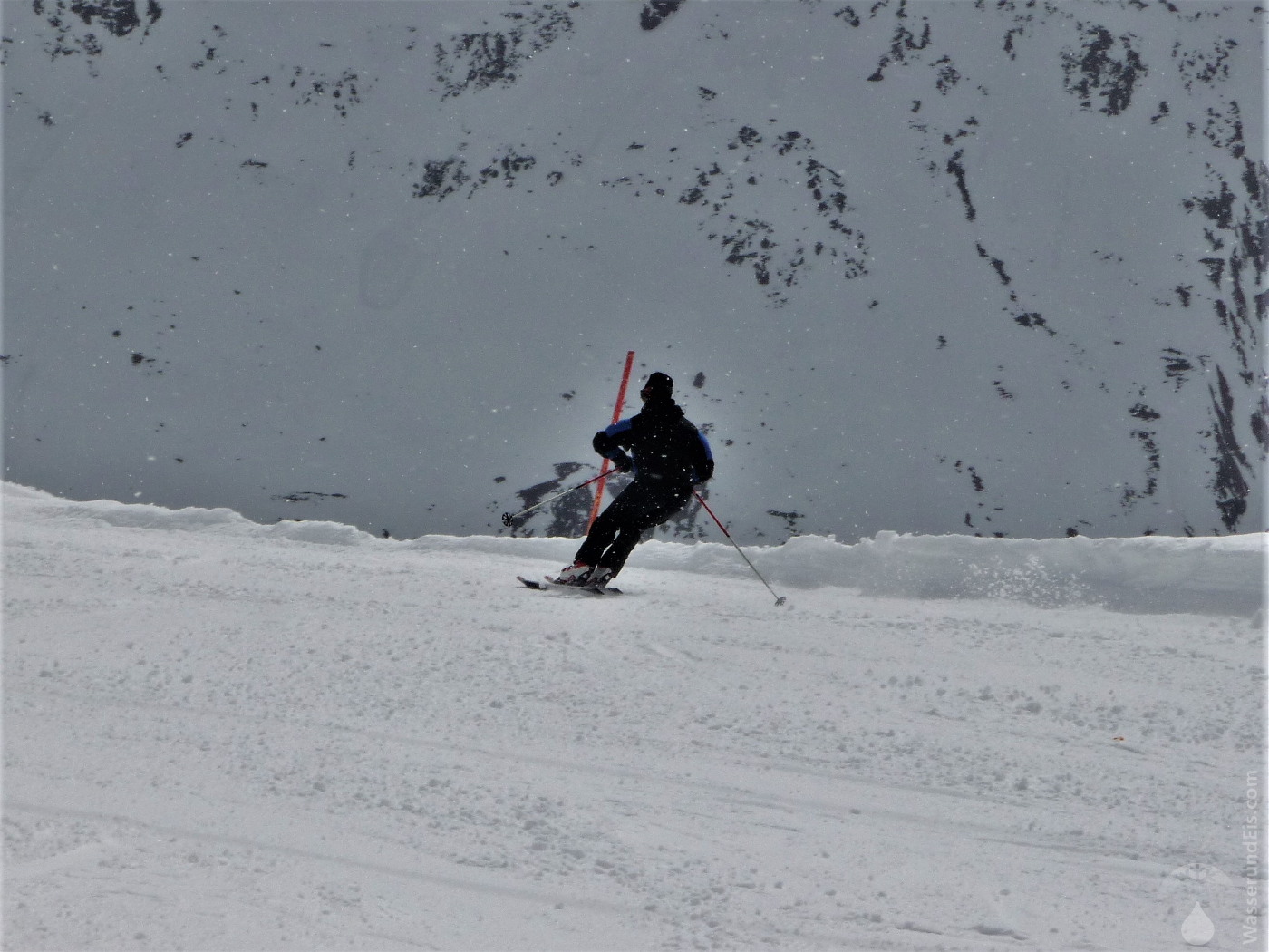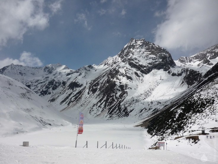 Zunächst geht es flach am Rifflsee, durch dessen hängendes Tal entlang, anschließend steil, in weiten Serpentinen hinab in das Taschachtal. Schließlich geht es über einen langen, teils vereisten Ziehweg, zurück nach Mandarfen. Ein Riesenspaß – auch zu späterer Stunde, mit tiefen Sult und Pfützen. Wieder oben, am Berg, ist der Rest des Skigebietes geöffnet. Mit ausnahme der sichtbar in den Berg gezimmerten Hänge am Grubenkopf, sind die Pisten sehr kurz. Nach der Mittagspause traten wir dann die Talabfahrt über die mittlerweile stark durchgeweichten Pisten zum Gletscherexpress an, 10°C sind eben doch zu viel für eine Schneedecke. Mal sehen was uns der Pitztaler Gletscher noch im Föhnsturm zu bieten hat.