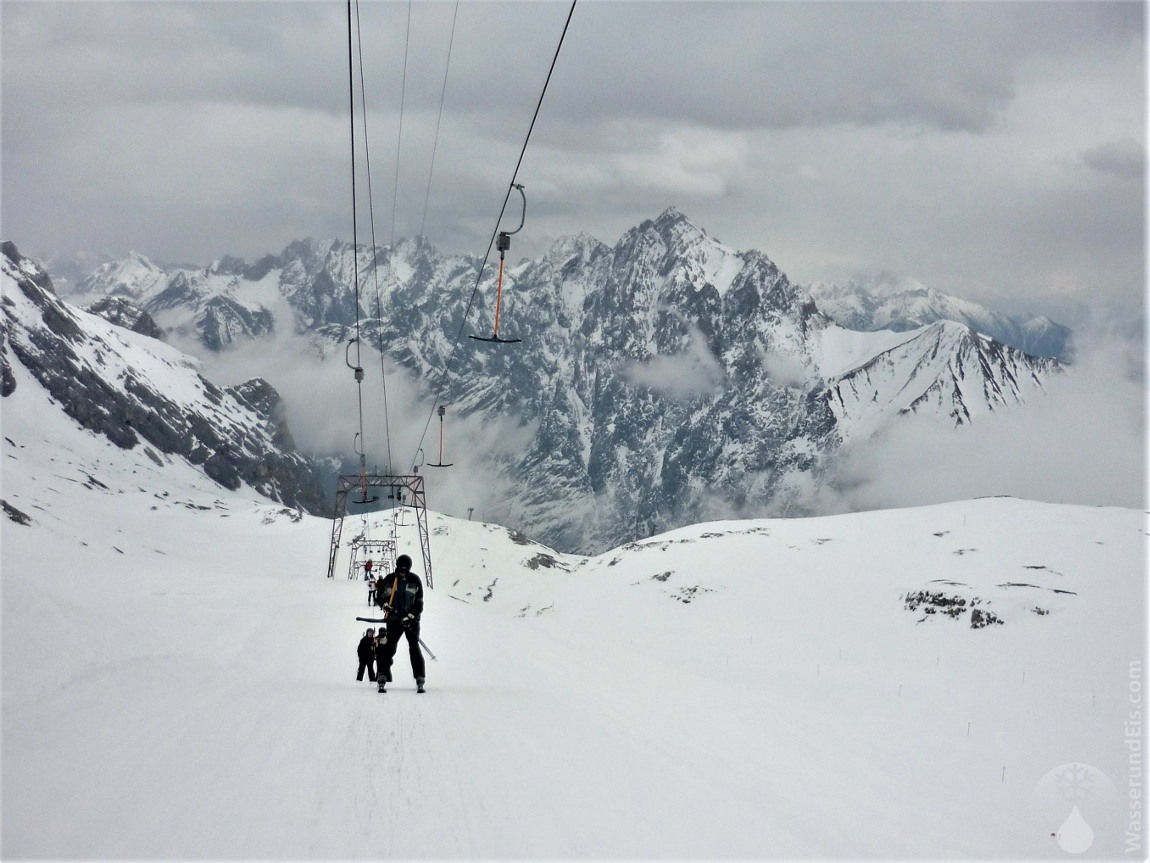 Im Gegensatz zu meinen vorherigen Besuchen auf dem Zugspitzplatt ging es diesmal und erstmals von der Tiroler Seite auf Deutschlands höchsten Berg. Die Kabine der Pendelbahn ist groß und Modern. Dazu sind wir am Mittag die einzigen Mitfahrer. Am Gipfel müssen wir dann umsteigen. Zuvor genießen wir aber noch das Panorama aus fast 3.000m. Immer wieder umwerfend. Ins Skigebiet geht es dann weiter mit der Gletscherbahn. Hier sind wir alles andere als alleine. Die Kabine ist mit Asiaten, vermutlich Chinesen, vollgestopft. Ein lautes „Aaaah“ verkündet uns das die Gondel sich in Bewegung gesetzt hat. Das entsprechende „Oooh“ markiert die Einfahrt in die Station am Sonnalpin. Dort trennten sich dann unsere Wege. Wir schnallten uns die Ski an, die Asiaten gingen mit der Kamera auf die