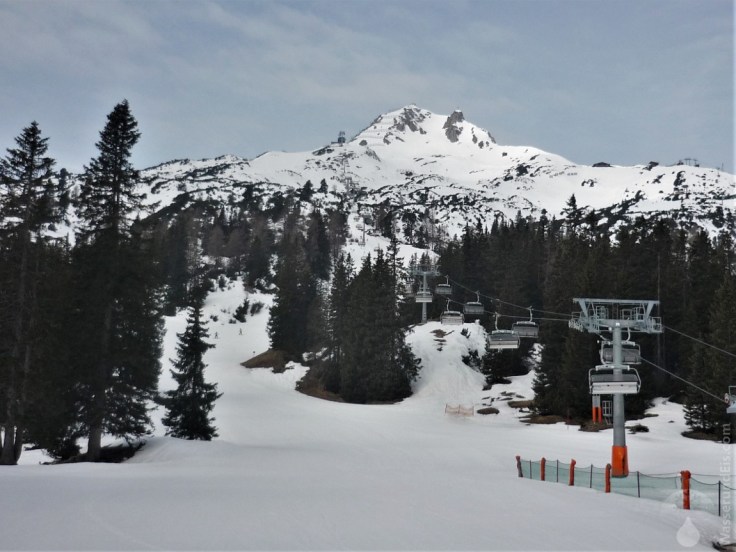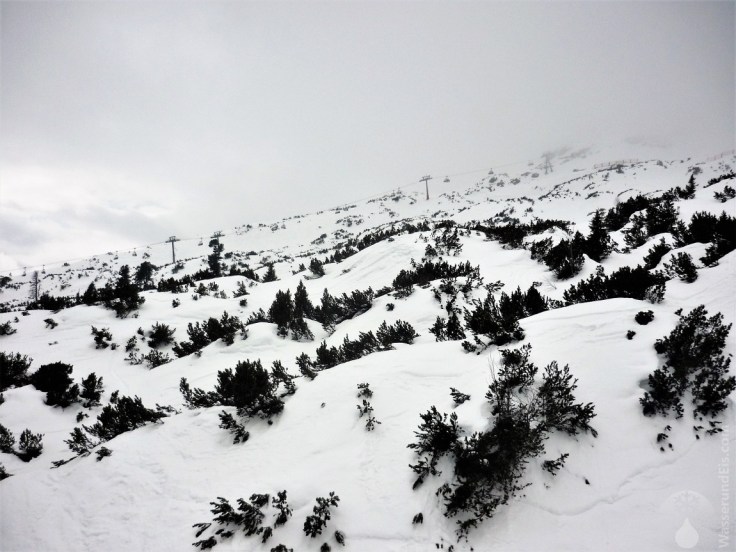 Grundsätzlich lässt sich das Skigebiet in 3 Etagen einteilen. Das Erdgeschoss reicht vom Talboden (um 1.000m) bis zur Mittelstation (1.330). Hier finden sich breite Abfahrten in weitgehend baumlosen Gelände – zur Zeit unseres Besuches finden sich hier nur mehr weiße Bänder auf braunen Wiesen. Eine regelrechte Sulzschlacht, sehr gewöhnungsbedürfigt. Das erste Stockwerk reicht von der Mittelstation bis zur Grubigalm (~1.700m). Dazwischen liegen sportliche und aussichtsreiche Abfahrten durch den Bergwald. Die Kulisse ist noch winterlich. Das zweite und oberste Stockwerk reicht knapp über 2.000m Seehöhe und damit über die Wald- und Baumgrenze hinaus. Hier finden sich überwiegens sportliche Pisten in hochalpinen Gelände mit einem umwerfenden Panorama.