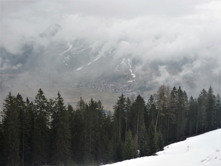 Das Skigebiet am Grubigstein reicht höher hinauf als an der Ehrwalder Alm, im Bergstationsbereich über 2.000m und über die Baumgrenze. Dazu ist es durch seine ostexponierte Lage weniger der Sonne ausgesetzt – entsprechend liegt hier noch weit mehr Schnee, auch abseits der Pisten. Der Eindruck ist winterlicher. Ganz unten führen die bereits schmalen und dünnen Schneebändern dafür über baumfreie, braune Wiesen, was bei der derzeitigen Schneelage einen etwas trostlosen Eindruck macht.