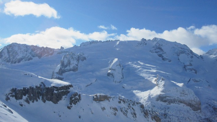 Ein klarer kalter Wintertag in Malga Ciapela.. Nur wenige, dünne, Schönwetterwolken sprenkeln den Himmel. Auf der Erde die bizarren, weiß gezuckerten Felsnadeln der Dolomiten. Direkt vor mir, ihre Königin, ihr höchster Gipfel, der gewaltige Felsklotz der Marmolata, 3.343m.