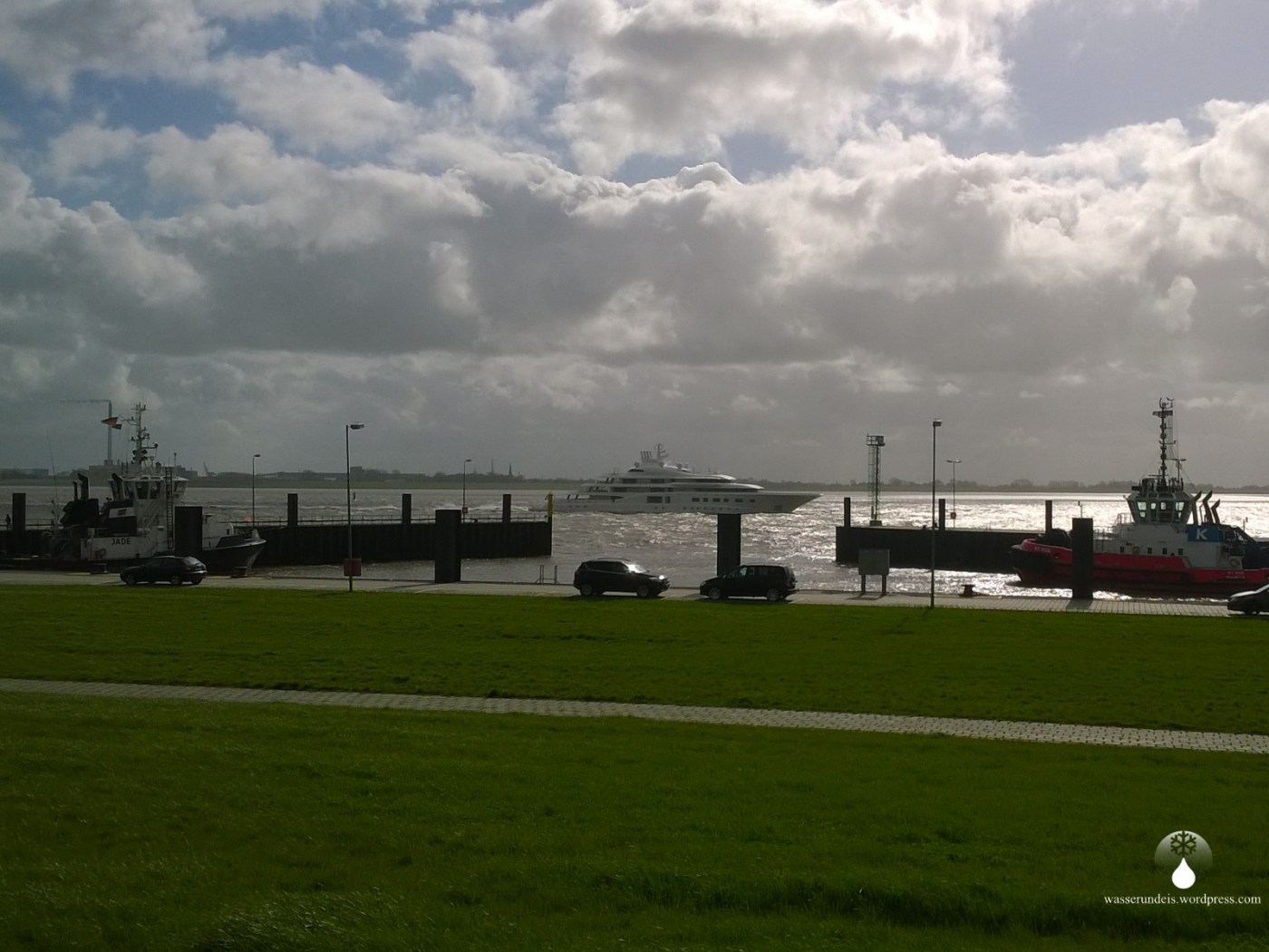 Gassigehen am Lohmanndeich, nichtahnend. Plötzlich fast neben mir, die Superyacht Eclipse.