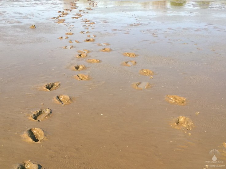 Ja, das Watt ist schlickig. Erstaunlicherweise aber nicht besonders tief. Kann man andernorts schon mal bis zu den Knien im Schlickwatt versinken ist im Watt vorm Ochsenturm schon an den Knöcheln Schluss. Trotzdem spritzt und schmatzt es bei jedem Schritt. Irgendwo hier muss sich das Dorf Lepstedt befunden haben bis es in den Fluten der Nordsee versank. Spuren finden sich heute keine mehr. Wir laufen bis zur Wasserkante und kehren dann zum Ufer zurück.