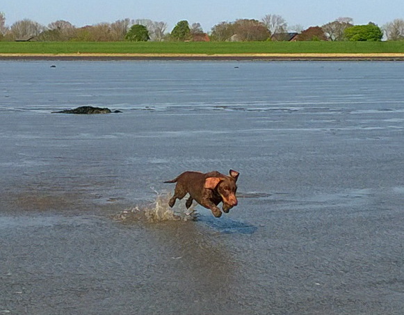 Ein warmer Sommertag verändert die Lage dramatisch – zumindest im Kopf. Vom Himmel brennt die Sonne. Vor glänzt das schlickige Watt, weiter hinten offene Wasserflächen. Die Versuchung ist groß, zu groß. Also Schuhe aus und rein.