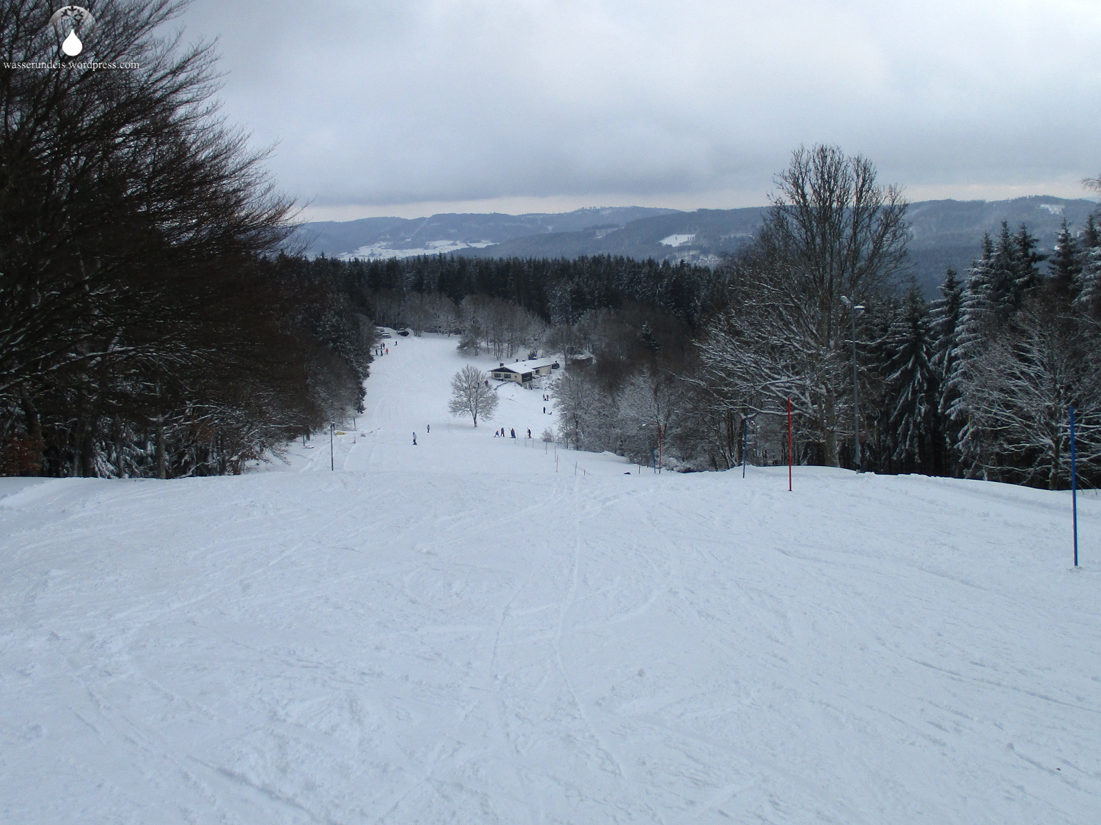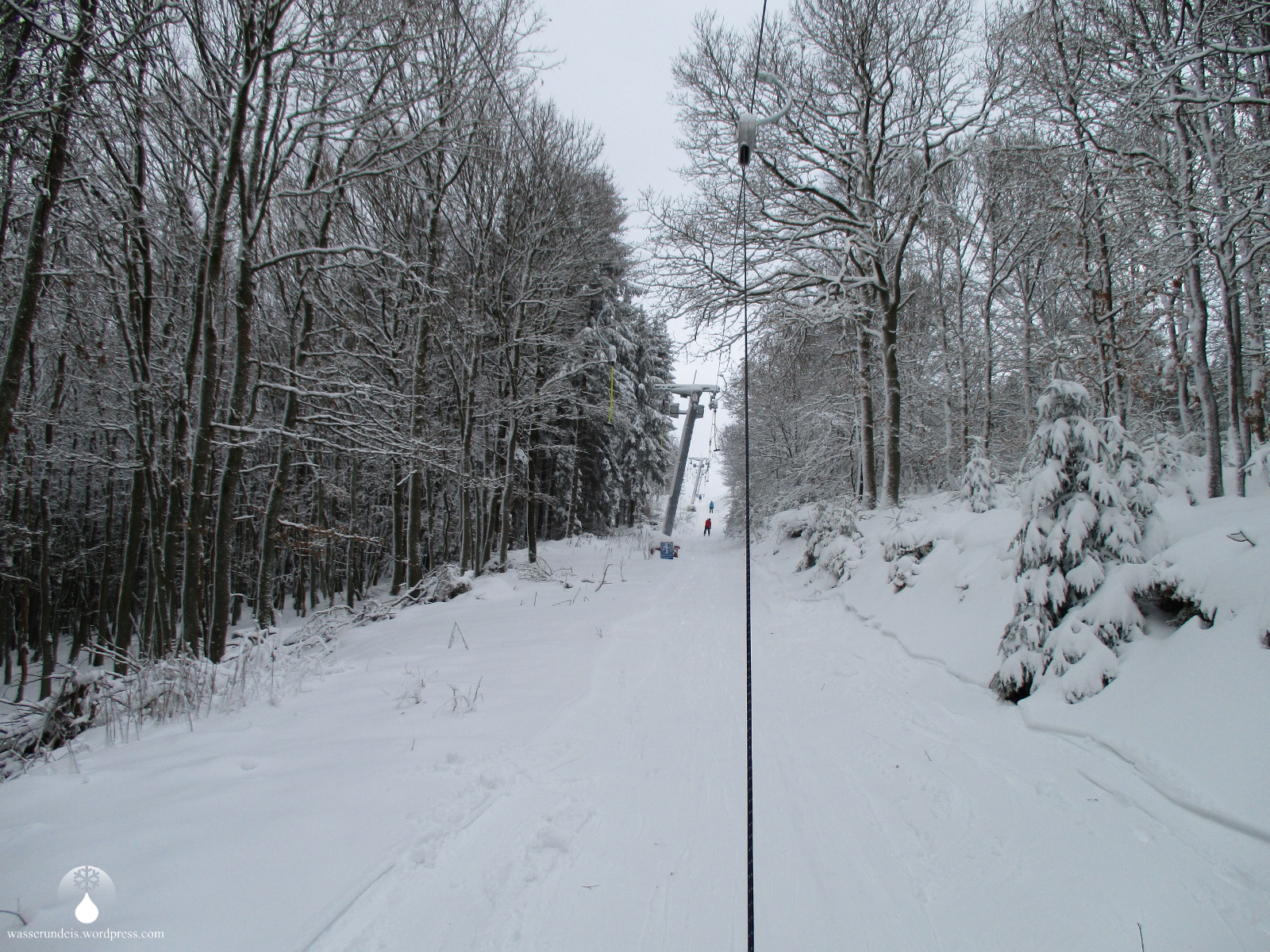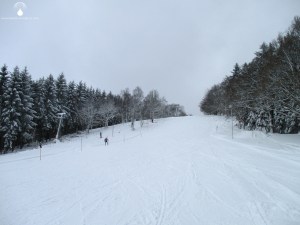Zwar ist die Abfahrt eher kurz und vergleichsweise flach. In Sachen Pistenzustand und Pflege ziehe ich aber meinen Hut. Trotz ausreichend Schnee (in dieser Region ohne Beschneiung alles andere als sicher), hatte man den Lift am Vortag extra nicht in Betrieb genommen, um die Piste, den Neuschnee , nach dem Walzen, „ruhen“ zu lassen. Das hat sich auf der Piste deutlich positiv bemerkbar gemacht – die Verhältnisse sind perfekt, wesentlich besser als an den vorherigen Stationen, Hirzenhain und Hartenrod. Viele andere Liftbetreiber können sich auf jeden Fall eine Scheibe Ewersbach abschneiden. Die perfekten Schneeverhältnisse sind, wie beschrieben, kein Zufall. Auch der Lift am Eichholzkopf ist recht neu, erst 2014 errichtete der Ewersbacher Skiclub den Tellerlift als Ersatz für einen einfachen Seillift.