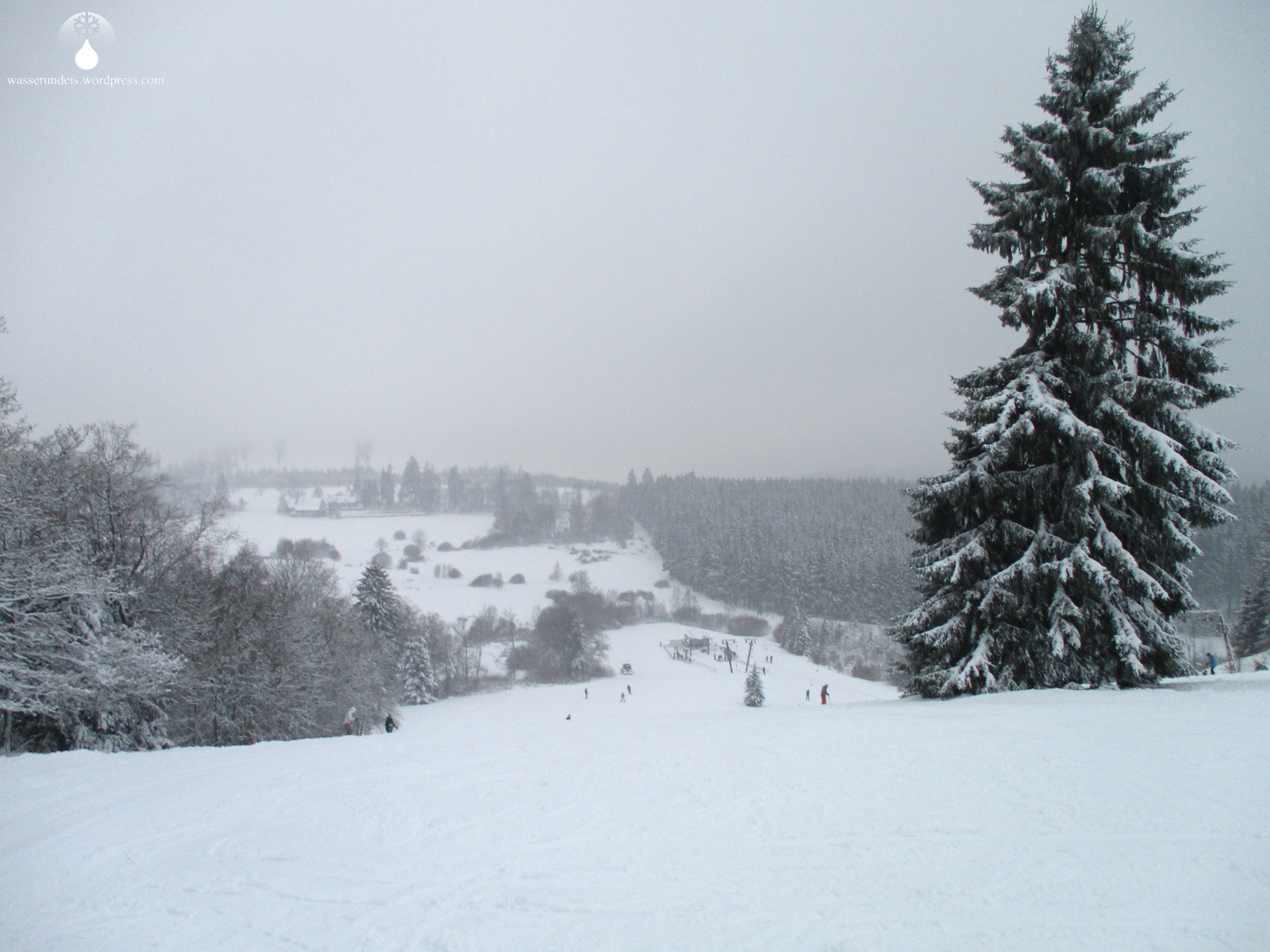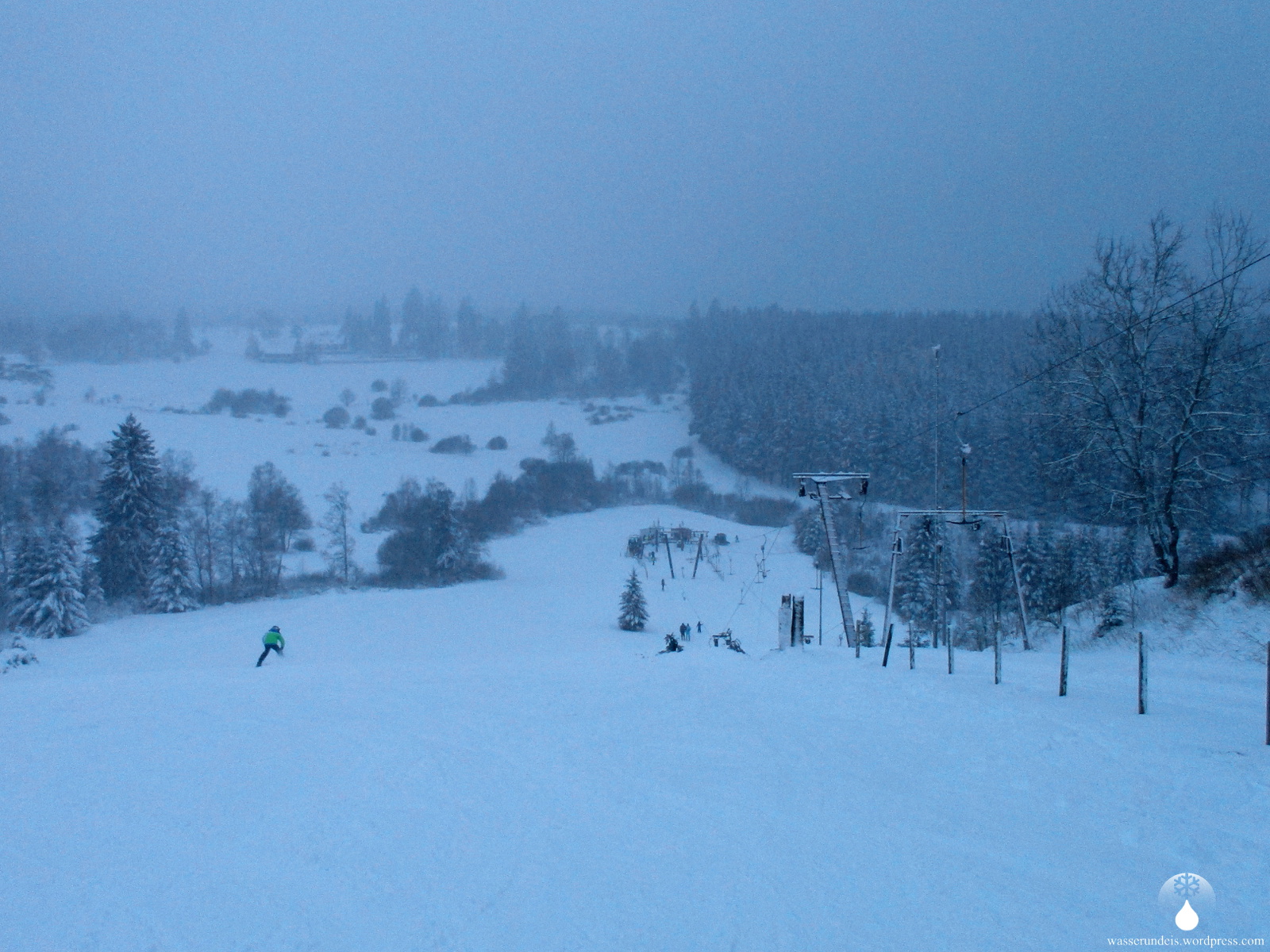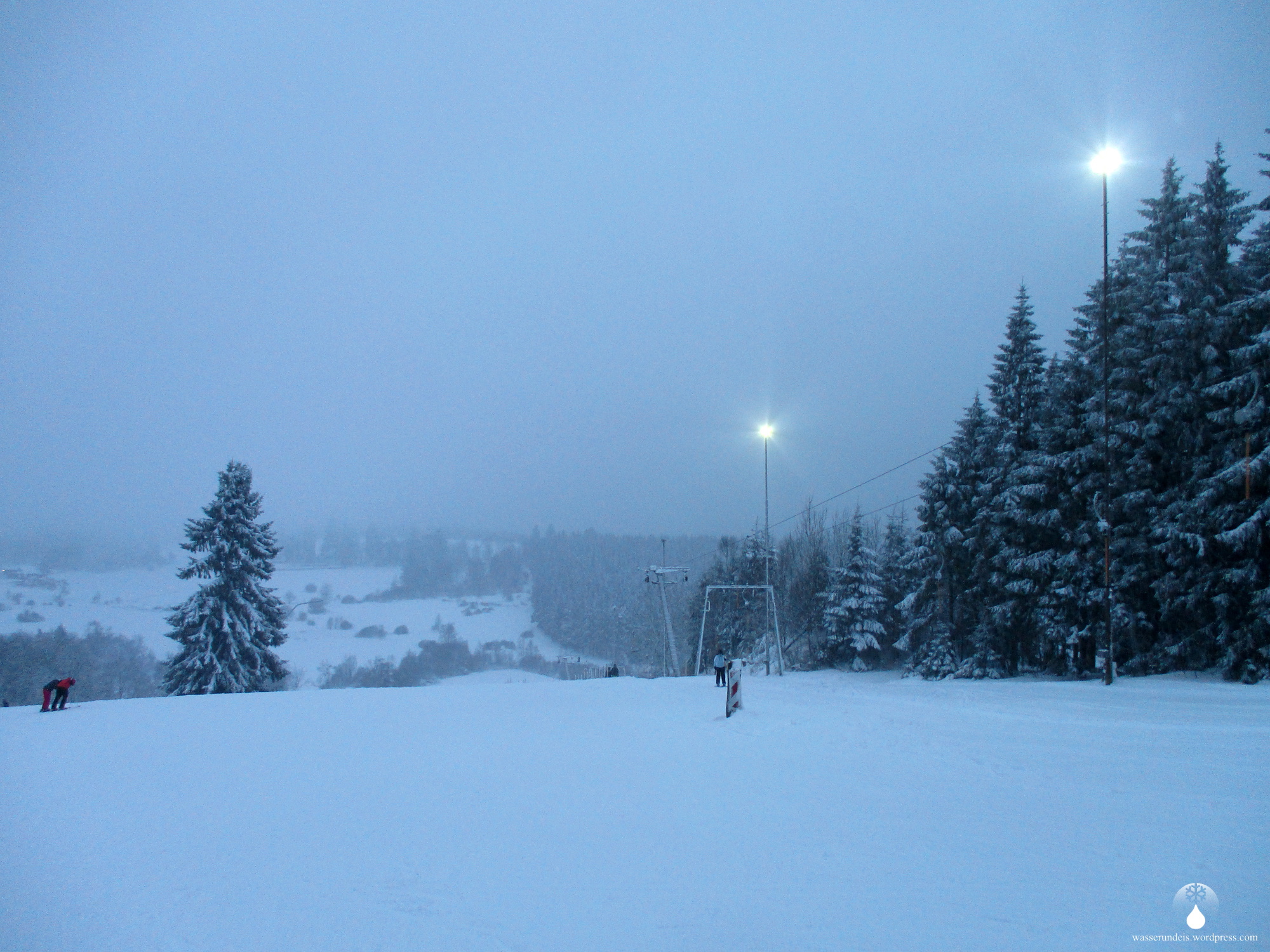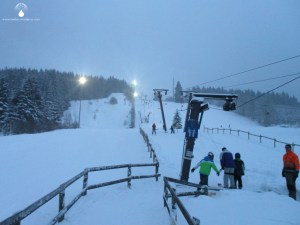 Die Piste ist schön breit und mit einzeln stehenden Bäumen durchsetzt. Sauerlandtypisch ist der Hang oben und unten flach, in der Mitte steiler – eigentlich ideal. Leider ist der Hang etwas kurz geraten aber, in der Kürze liegt die Würze. Die Schneeverhältnisse sind perfekt. Lockerer, kaum aufgefahrener Pulverschnee. Dank toller Neigung und breiter Abfahrt lassen sich bei angenehmer Geschwindigkeit einige weite Schwünge in den Schnee setzen. Doch das ist noch nicht alles. Bei mäßigem Andrang laufen beide Aufstiegsanlagen – in vollem Tempo. Doch noch nicht genug des Lobes, abgerundet wird das ganze von freundlichem Personal an der Talstation – immer für einen kleinen Plausch zu haben. Keine Selbstverständlichkeit. Daumen hoch.