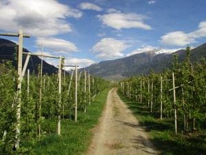 Am späten Nachmittag erreiche ich dann mein Ziel. Dieses liegt etwas erhöht, gegenüber der Einmündung des Schnalstals, im unteren Vinschgau – inmitten von Apfelplantagen. Hier ist der Frühlingseinzug bei Temperaturen um 20°C bereits vollzogen. Doch auch ein wenig Trübsahl muss erlaubt sein. Der viel zu warme Winter brachte die Apfelbäume verfrüht zur Blüte, ein Frosteinbruch machte diese dann wieder zunichte. Ein Großteil der Ernte – gefährdet. Dazu kommt noch die Trockenheit. Im gesamten Winter gab es kaum Niederschlag.