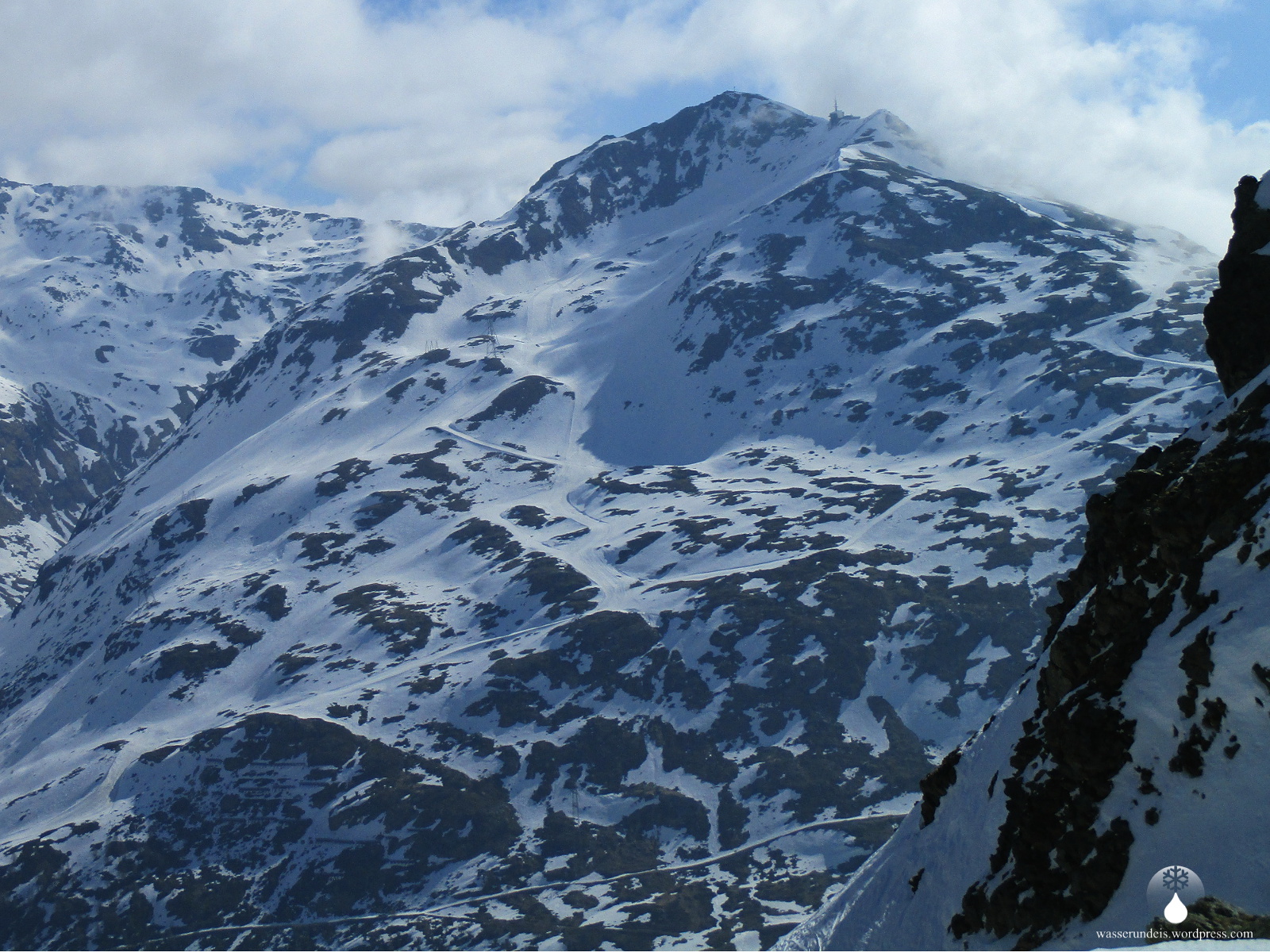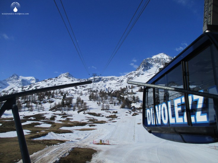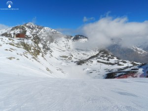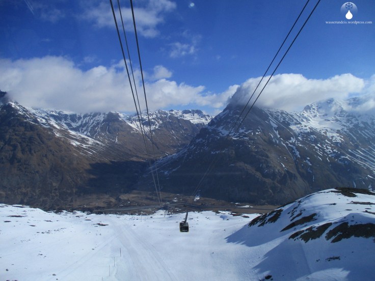 Neben den Gletscherabfahrten gibt es noch die Talabfahrt, die eigentliche Hauptpiste. Diese ist überwiegend einfach mit 2-3 Paradehängen im Verlauf, Abfahrtsvarianten gibt es heute keine. Der Schnee ist hier und dort, wo die Sonne hinkommt, bereits in traumhaften Firn verwandelt. Dennoch, der Schnee ist teils schon etwas knapp. Die ein oder andere braune Stelle gibt es bereits, vor allem in Richtung Talstation. Nach oben geht es wieder mit der Gondelbahn, wobei der Weg durch die Talstation, auf Dauer, schon etwas beschwerlich ist. Das ließe sich sicher besser lösen, beispielsweise Drehkreuzen direkt am Gondelzugang.