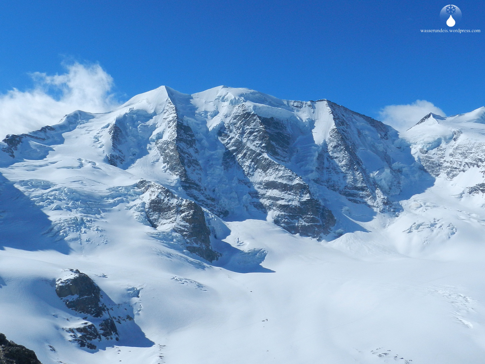 Nach dem Skipasskauf, 57 Franken (52,2€) werden für ein Vormittagsticket fällig geht es zügig auf den Berg. Die Gondel ist kaum gefüllt, schnell geht es nach oben – 8 Minuten später stehe ich auf dem Berg. Die Kulisse hier oben ist – überwältigend, das Panorama, umwerfend. Der Begriff „Festsaal der Alpen“ ist fast noch untertrieben. Das Skifahren habe ich erstmal vergessen, meine Bretter stehen irgendwo vor der Bergstation. Der Blick schweift vom Piz Palü (3.900m) zum Piz Bernina (4.049m). Dann über den Persgletscher bis zum Eisstrom Morteratsch. Faszinierende Eisformationen, schroffe Felsen – ich bin überwältigt. Klar, die Fernsicht von Zugspitze, Dachstein & Co, die gibt es hier oben nicht. Dafür sind die Berge hier einfach zu hoch, aber dafür, sind sie da. Deshalb bin ich hier.