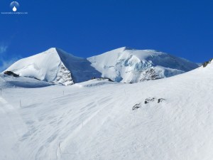Nach einer ganzen Weile schnalle ich mir dann doch die Ski an. Trotzdem halte ich bei jeder Bergfahrt, sei es mit der Seil- oder der Sesselbahn inne. Zum Skigebiet, die oberen „Gletscherabfahrten“ sind relativ kurz. Die Hauptabfahrt ist etwa 1000m lang bei 200m Höhendifferenz, oben steil, in der Mitte flach unten dann wieder etwas steiler. Der Schnee ist zwar recht hart – aber toll zu fahren. Die Piste macht Spaß. Links der Sesselbahn gibt es noch eine weitere, Bullispurbreite Abfahrtsvariante. Es ist so gut wie nichts los, vielleicht 50 Skifahrer im Gebiet, die man aber selten zu Gesicht bekommt. Für etwas Abwechslung sorgt ein Synchronskiteam – das macht optisch schon was her.