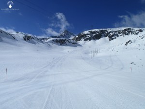 Die Diavolezza ist eine 2.973m hohe Erhebung, geradezu winzig im Vergleich mit den Bergriesen in der unmittelbaren Nachbarschaft – aber ein einmaliger Aussichtspunkt. Das dazugehörige Skigebiet ist eher klein. Neben der Talabfahrt an der Seilbahn, die immerhin 880 Höhenmeter auf fast 5 Kilometer Länge aufweist, gibt es nur noch einen weiteren Lift. Die „Gletscher-Seilbahn“ erschließt den oberen Kessel auf den Eisresten des winzigen Diavolezzafirns. Einstmals wurde hier Sommerskilauf betrieben, heute ist der Gletscherrest praktisch verschwunden. Die Pisten sind, in dieser Form, nur durch aufwändiges Snowfarming zu halten. Davon ist aber im Winter nichts zu sehen.