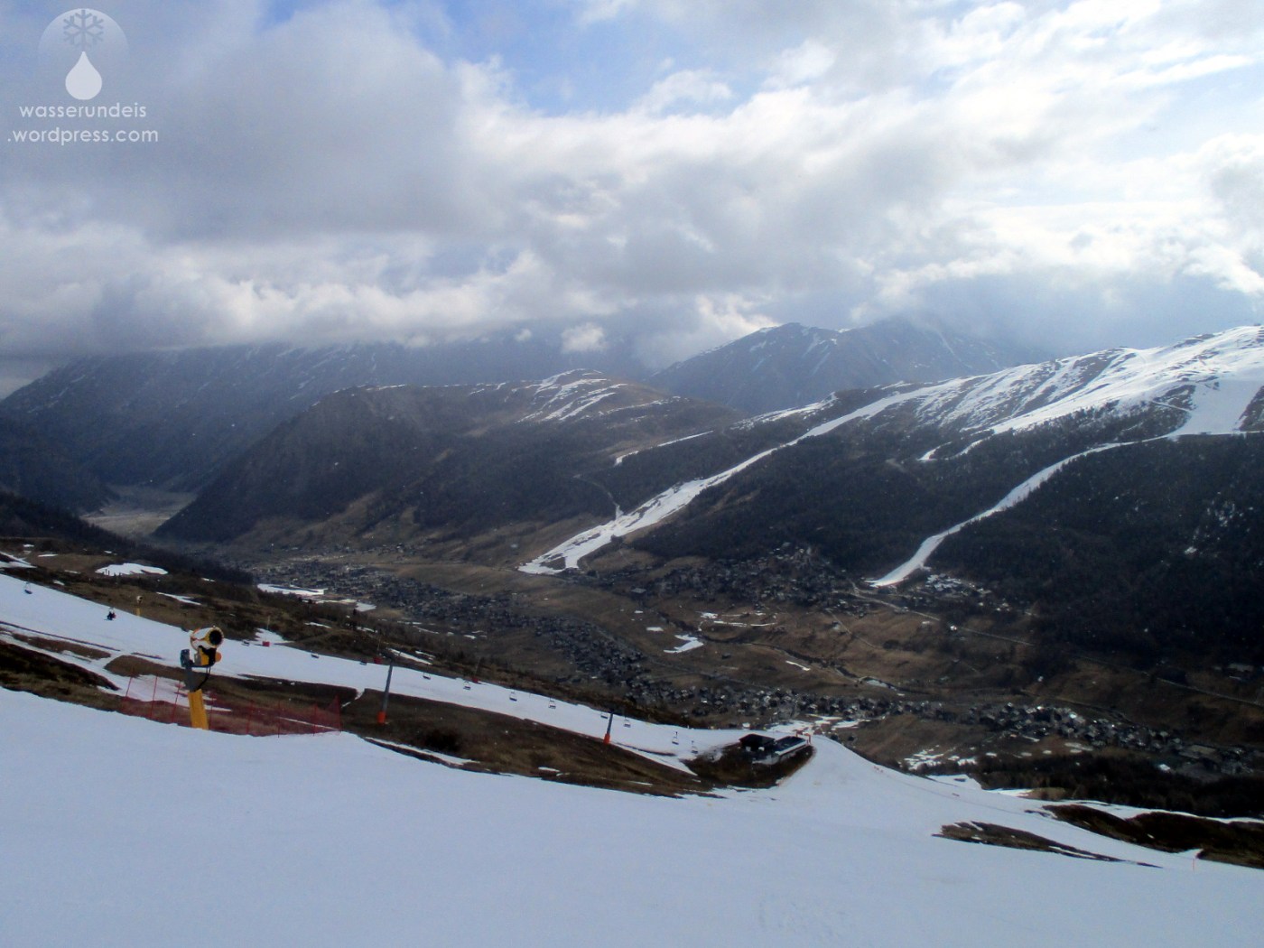 Am Morgen sind die Pisten am Berg nach Nachtfrost noch recht hart und ruppig, immerhin erreicht das Skigebiet knapp die 2.800m Marke.´. Für diesen späten Saisonzeitpunkt sind noch reichlich Skifahrer unterwegs – das habe ich schon anders erlebt. Hier und da ist der Schnee aber auch in der Höhe schon knapp. Dreck und Steine mischen sich unter den Schnee. Da Sonne & Wolken einen schweren Kampf um die Hoheit am Himmel austragen und es zunächst nach einem Sieg der Wolken aussieht, bleibt der Schnee in der Höhe noch etwas länger hart. Weiter unten verwandelt sich das Weiße Gold schnell in Firn, später in tiefen Sulz.