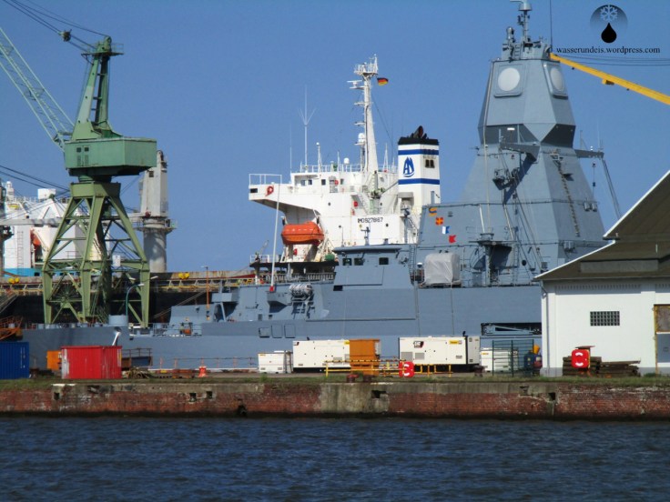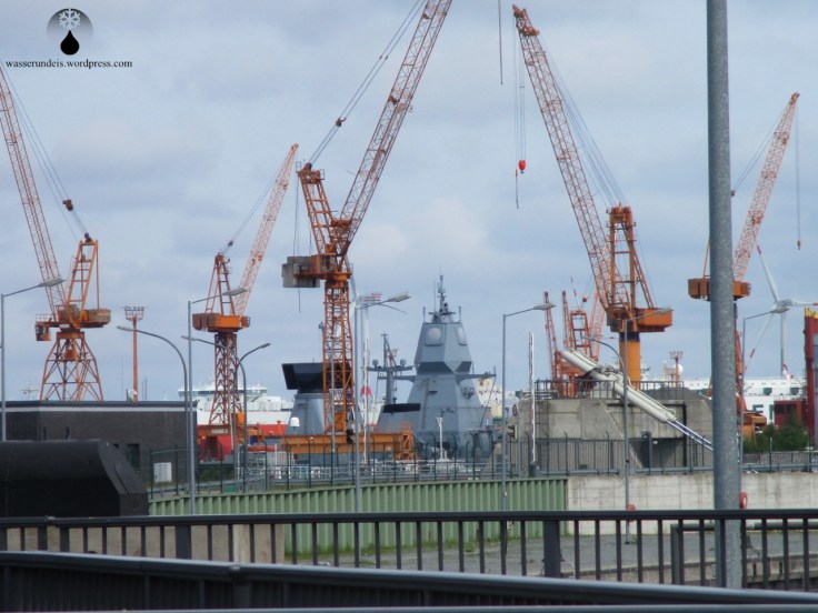 Derzeit wird gegenüber, im Kaiserdock der Lloyd-Werft, die Fregatte Sachsen überholt. Das Schiff der Bundesmarine war erst im April, nach fast viermonatige Einsatz im Zuge der Flüchtingskrise in der Ägais, in ihren Heimathafen Wilhemshaven zurückgekehrt.
