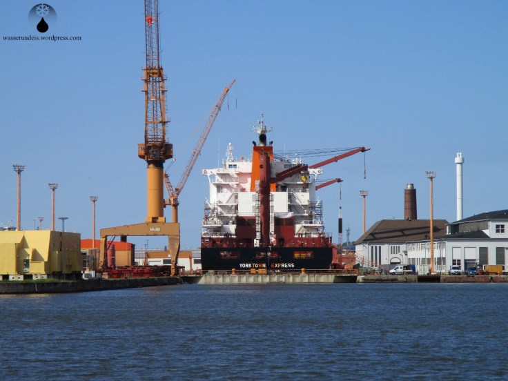 Scheinbar bei der Lloydwerft die Zeit der leeren Auftragsbücher vorbei. Der Fortbestand vorerst gesichert. Ein Auftrag der öffentlichen Hand tut immer gut. Auch im Schwimmdock liegt ein Schiff, das Containerschiff Yorktown-Express.