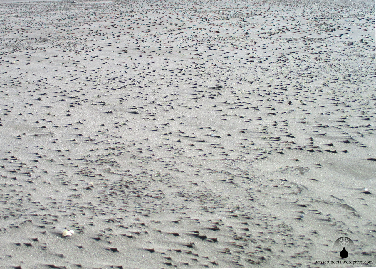 Zurück bleibt eine vom Wind gezeichnete Oberfläche. Im Windschatten von Muscheln bildet sich z.B. eine Windfahne, weche die ursprüngliche Höhe der Sandoberfläche zeigt. Die Fahne zeigt in die entgegengesetzte Richtung des Windes.