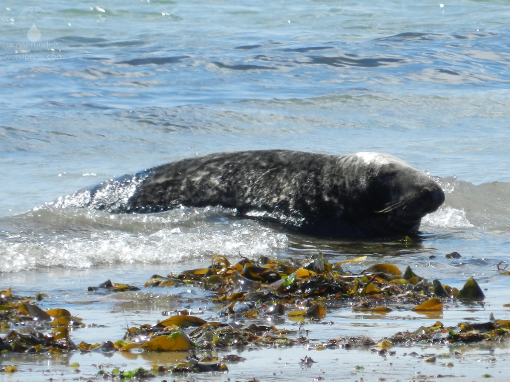 Männliche Kegelrobbe am Strand der Düne in der Nordsee.