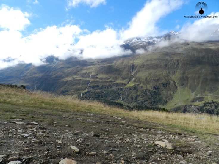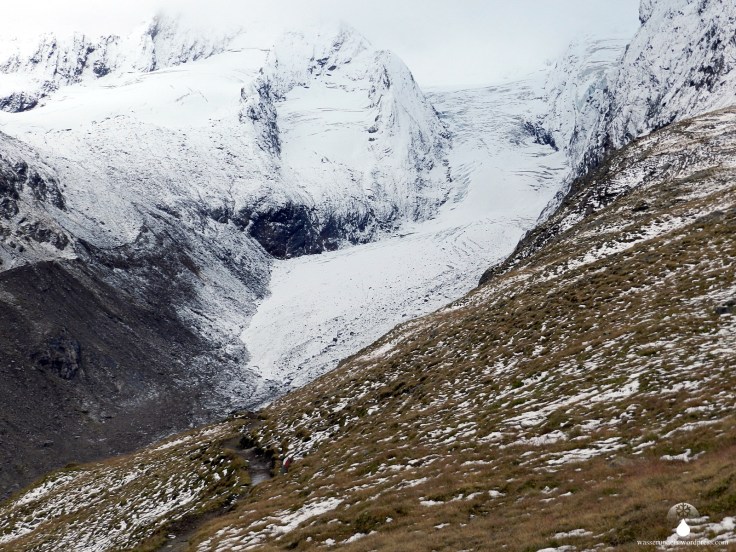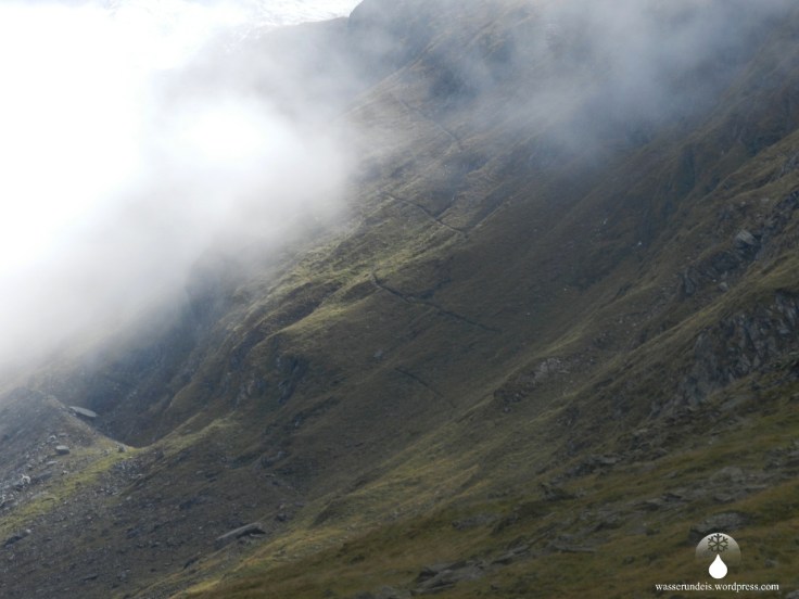 Leider zieht jetzt dichter Nebel das Gaisbergtal hinauf. Deshalb streichen wir den Besuch am Gletscher, der schmale Pfad, immer den Abgrund entlang ist uns bei diesen Sichtverhältnissen nicht ganz geheuer. Entsprechend geht es die Serpentinen hinab – oft nicht weniger schmal und dafür auch deutlich steiler. Der Abstieg endet an der Gletscher-Endmoräne der kleinen Eiszeit. Seither ist der Gaisbergferner, von kurzen Vorstößen um 1920 und 1980, zurückgeschmolzen.