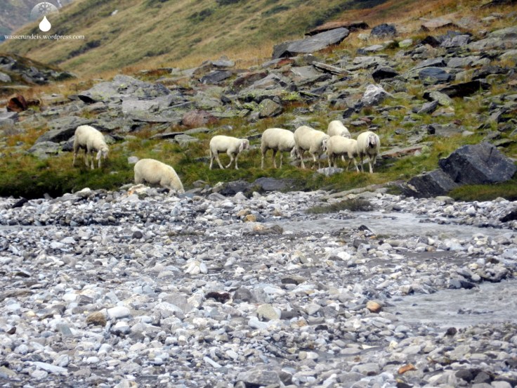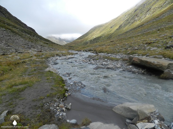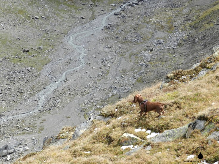 Von hier an führt der Pfad durch das wilde, unberührte Gaisbergtal, immer den Gletscherbach entlang. Eine Weile sind nur die Glocken der am Hang weidenden Schafe zu hören. Später lichtet sich der Nebel und die Tiere sind auch zu sehen. Gelegentlich durchschneided der schrille Pfiff eines Murmeltieres die nur durch das Rauschen des Baches durchbrochene Stille. Ab und an ist auch eines der großen Nagetiere zu sehen. Es wird wohl geprüft ob wir, oder unser vierbeiniger Gefährte, eine Bedrohung darstellen könnten. Vielleicht aber auch einfach nur gewarnt.