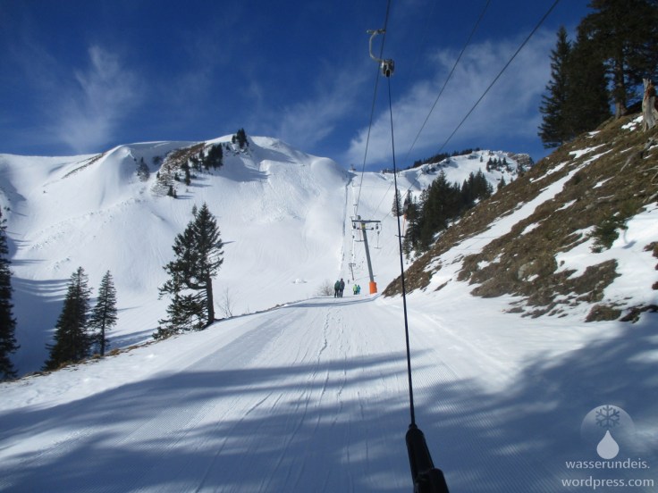 Ich sitze in der Breitenbergbahn, im westlichen Allgäu, unweit von Pfronten. Der Talboden ist grün-braun, mit einzelnen Schneeflecken. Die Talabfahrt, so man davon sprechen kann, ist nicht befahrbar.