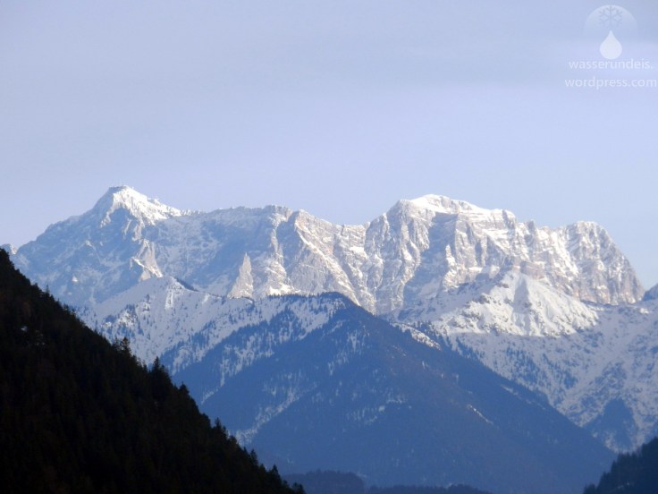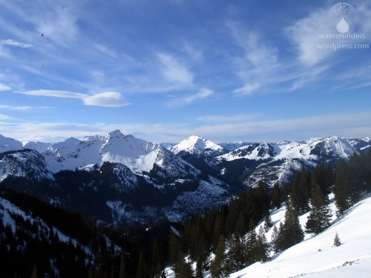 Oben angekommen herrscht Winter. Tiefster Winter. Die dünne Wolkendecke ist gerade dabei sich aufzulösen. Ein schöner Skitag steht bevor. Über dem in sanftem Almgelände gelegenen Skigebiet dominiert der felsige Aggenstein. Der vom Tal aus markante Breitenberg ist von oben gesehen kaum mehr als ein Hügel.