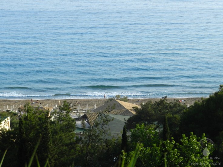 Der Strand von Glyfada, mit goldfarbenen Sand und türkisblauem Wasser ist vielleicht einer der schönsten auf Korfu – in jedem Fall der Favorit der von uns besuchten. Er liegt an der Westküste, ungefähr in der Mitte der Insel in einer weiten Bucht eingerahmt zwischen den felsigen Klippen der benachbarten Berge.