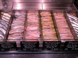 Diverse Matjesvariationen in der Frisch Fischtheke von Fisch 2000 in Bremerhaven. Dem Fischladen ist der Stadt.
