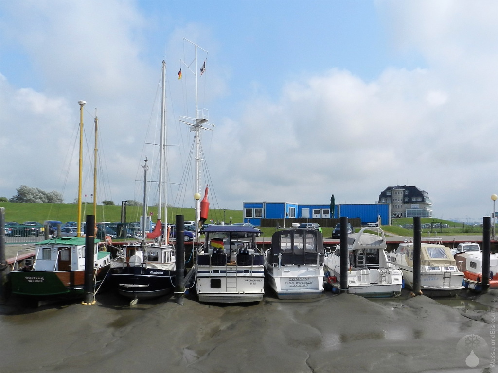 Trockengefallene Boote im Wremer Sielhafen.