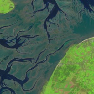 Satellitenbild des Wattenmeers, des Priels Duhner Loch, zwischen Cuxhaven und Neuwerk vom Juni 2017. Aufnahme des Erdbeobachtungssatelliten Sentinel 2.