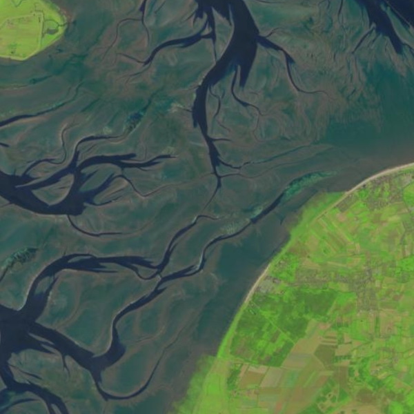 Satellitenbild des Wattenmeers, des Priels Duhner Loch, zwischen Cuxhaven und Neuwerk vom Juni 2018. Aufnahme des Erdbeobachtungssatelliten Sentinel 2.