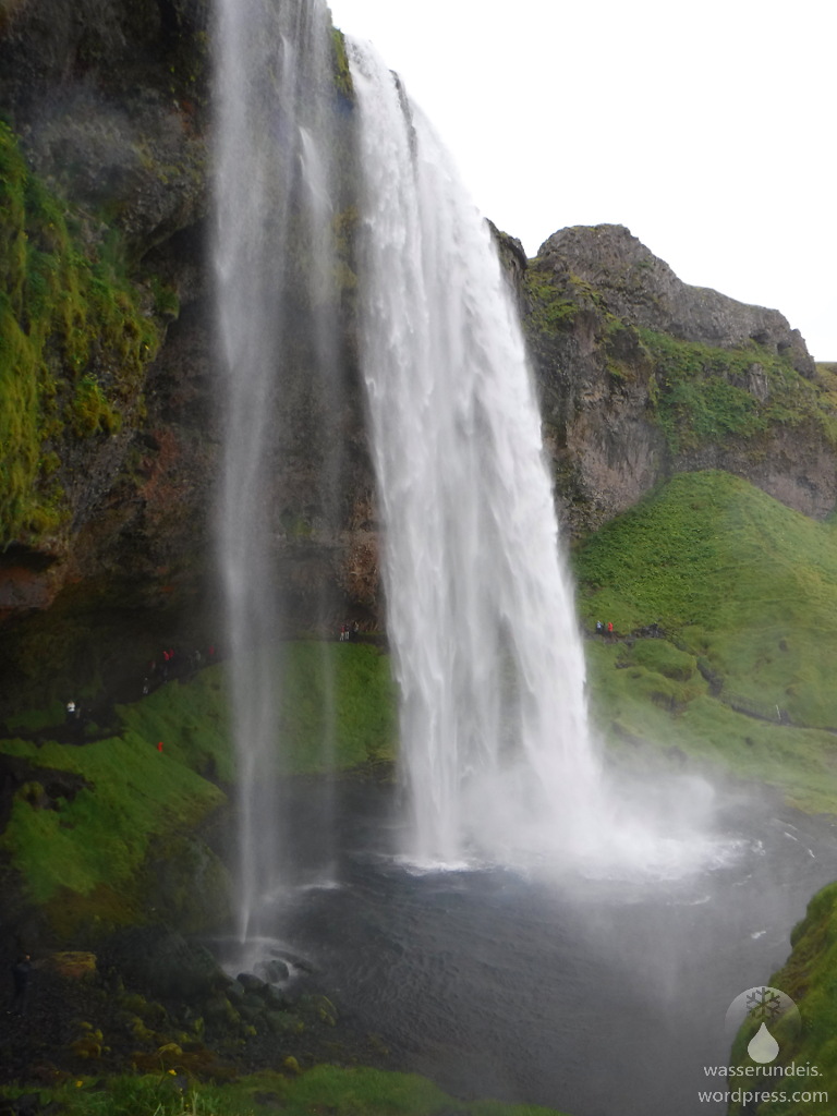 Blick hinter den Wasserfall Seljalandsfoss in Island.