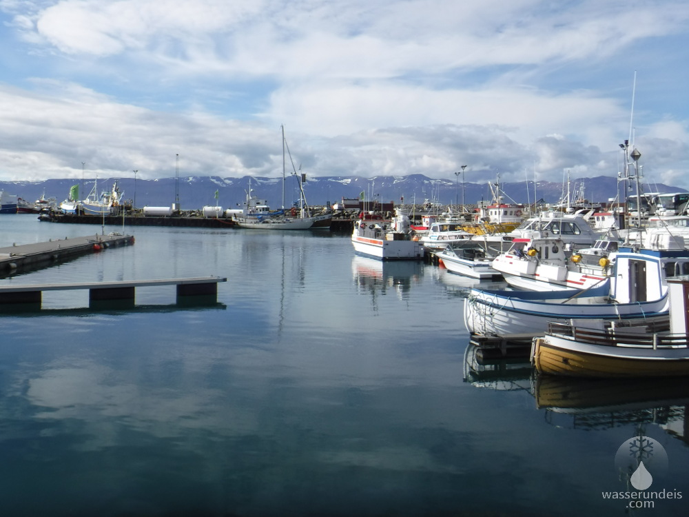 Der Hafen des Fischerdorfes Husavik in Nordisland am Arktischen Ozean.