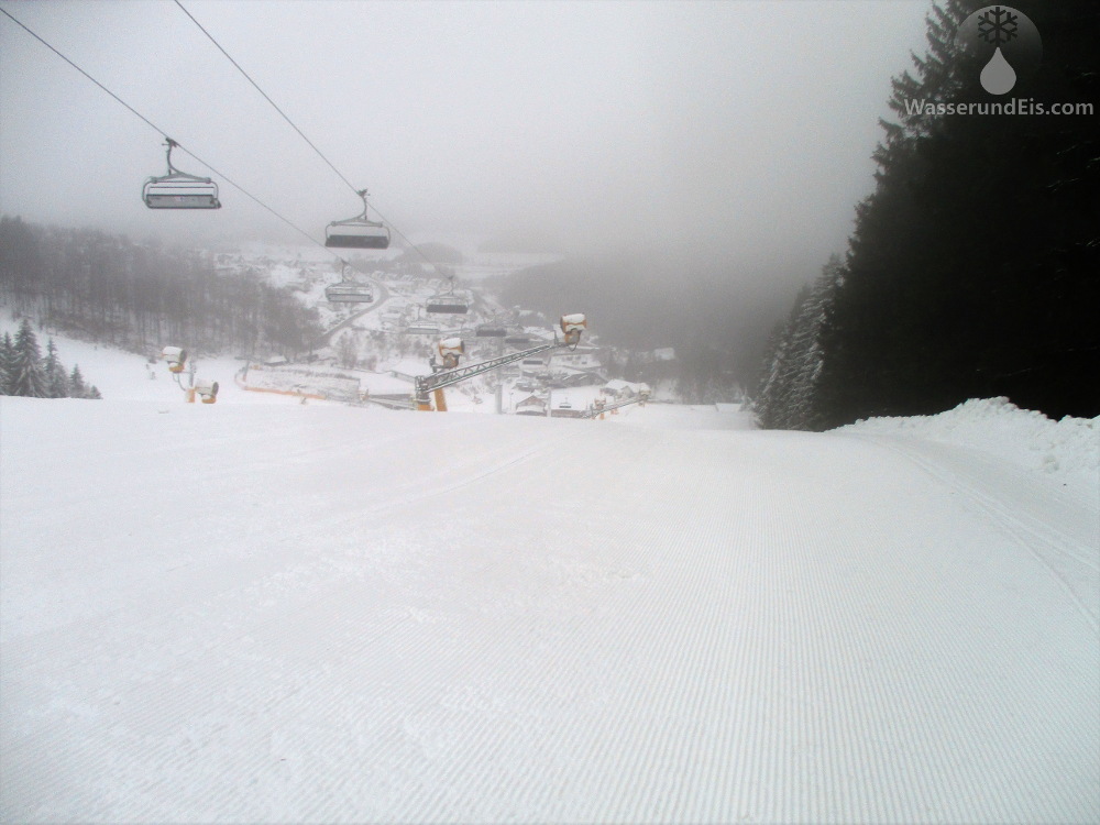 Kaum vier Tage mit Minusgraden hat es gebraucht bis aus den grün-weiß-braunen Wiesen des Skiliftkarussell Winterberg befahrbare Pisten wurden. Inzwischen sind die Temperaturen gestiegen, es taut leicht. Dafür stehen die Schneekanonen still, die Hänge frei. Jetzt beginnt auch für mich der Skiwinter. Bis gestern liefen immerhin vier Lifte, heute sind nach intensiven Schneeverschiebungen – den kalten Temperaturen und der Beschneiung sei Dank, noch einige dazugekommen. Ein schöner Start in den Skiwinter, auch wenn die „Sucht“ bei mir in den letzten Jahren deutlich nachgelassen hat.