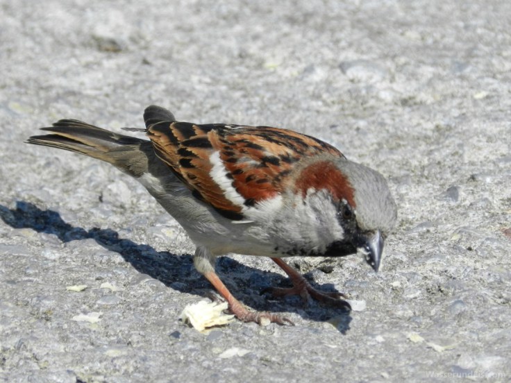 Schließlich erreichen wir das Ufer der Elbe, die Mündung der Lühe am Fährhafen nach Wedel. Hier stehen einige Buden, es gibt Bratwurst und Fischbrötchen. Wir halten ein wenig inne, beobachten die Schiffe auf der Elbe und die Spatzen am Ufer – ab und an fällt ein Krümel ab. Schließlich machen wir uns auf den Rückweg.