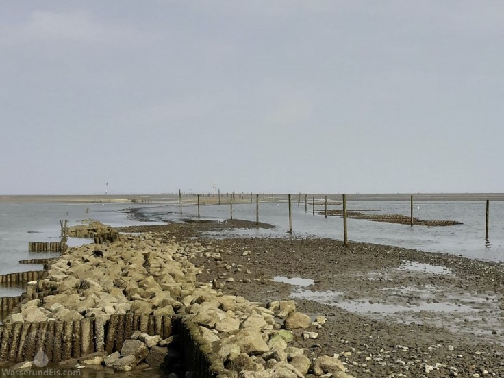 Ich bin der einzige Wattwanderer weit und breit. Die Flut kommt bereits. Die Strömung am Steindamm im Sahlenburger Loch ist bereits am Kipppunktwar bereits, zeigt noch so eben in Richtung Meer. Schnellen Schrittes laufe ich den letzten Kilometer in Richtung Duhner Loch. Ich kann schon von weitem erkennen, dass der Priel schon vollgelaufen, ein Weitermarsch mit Erkenntnisgewinn sinnlos ist. Außerdem drückt die Zeit, ich muss schließlich wieder zurück durchs Sahlenburger Loch – und das Wasser steigt schnell.