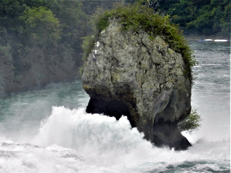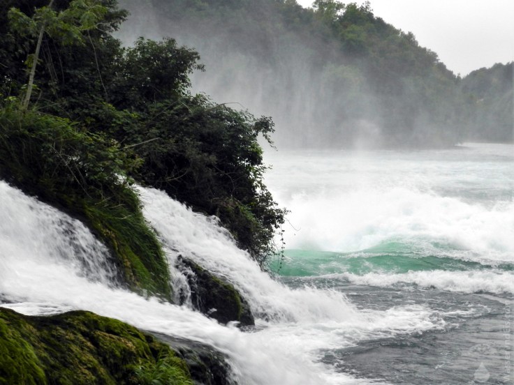 Rund vier Kilometer westlich der Kantonshauptstadt Schaffhausen ergießen sich die tosenden Fluten des Rheins über eine 150m breite und 23m hohe Felsstufe. Die 23m Höhenunterschied werden allerdings nicht auf einen Schlag, sondern in mehreren Stufen auf einer Länge von gut 100m überwunden. Mitten in den Stromschnellen liegen einige Felsen. Kleine Inseln, die den stetigen Gewalten des Stroms trotzen konnten – bislang zumindest. Die dem Wasserfall zugewandte Seite ist der Wucht des Wasser vollends ausgelifert, vor den Felsen liegt eine regelrechte Bugwelle. Entsprechend glatt und ausgewaschen präsentiert sich das Gestein. Spektakulär!