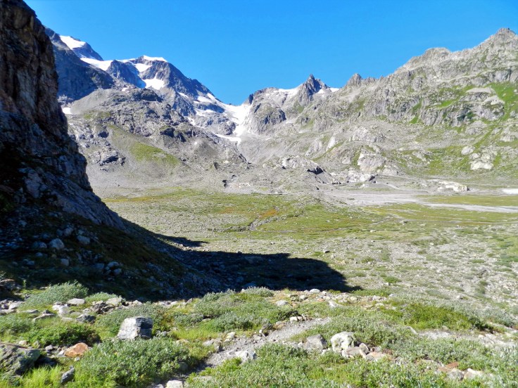 Vom Weg abkommen ist mit eingeplant, denn auf Karten existiert er nicht. Ist der Weg zunächst noch bequem zu gehen, steigt er schnell merklich an. Die Landschaft wird rauher, das Grün weniger. Aufgrund vom losem Schotter komme ich oft nur mühsam vorran. Manchmal muss ich mir, mangels Weg, einen eigenen suchen. Schließlich erreiche ich die Seitenmoräne des Steingletschers (3,1km/2.110m). Der Blick öffnet sich auf den Steinsee, einem weiter oberhalb gelegenen, weiteren kleinen See und das fast unbewachsene, ehemalige Gletscherbett. Ich bin völlig allein in der Natur – mit dem Wind und der Landschaft.