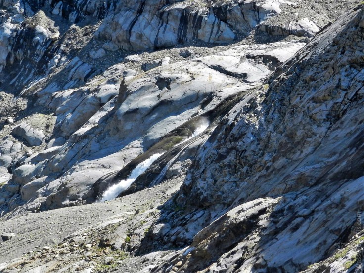 Jetzt wird es wirklich anstrengend. Obwohl nur noch ein kurzer Weg vor mir liegt, zieht sich die Strecke. Über losen Moränenschutt geht es mal steil bergauf, mal teil bergab, zwei Schritte vor, einen zurück. Trittsicherheit ist erforderlich. Manchmal muss ich die Hände zu Hilfe nehmen und ab und zu höre ich ein Murmentier pfeifen. Schließlich liegt der letzte Felsriegel vor mir. Hinter diesen hat sich die Zunge des Steingletschers in den letzten Jahren zurückgezogen – erstmal, denn der Rückgang geht weiter (3,3km/2.150m). Zum losen Schutt gesellt sich nun auch immer öfter, blanker, glattpolierter Fels – ich stehe nun fast am Eisrand (3,5km/2.220m).