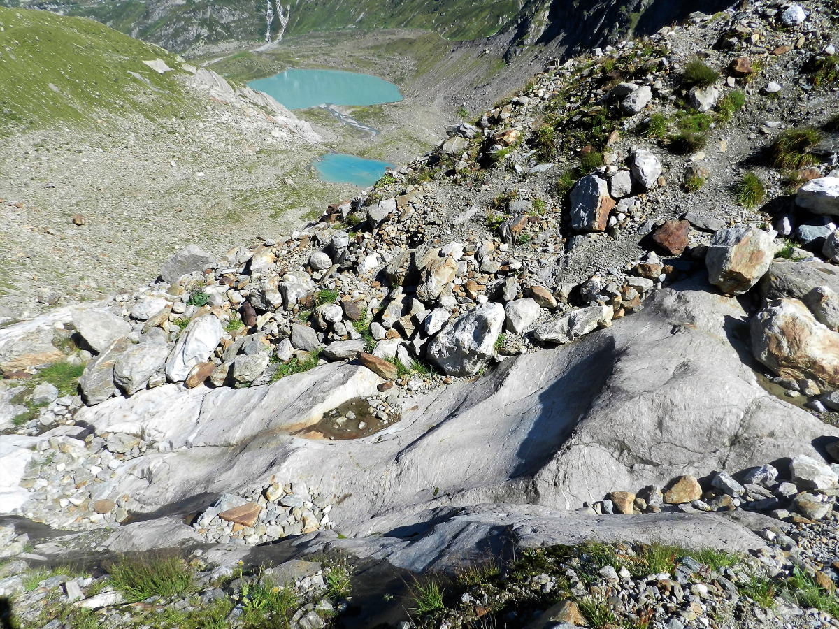 Der Steingletscher hat aber nicht nur an Länge verloren, der Eisrand hat sich auch in höheres, unzugänglicheres Gelände zurückgezogen. Lag das Gletschertor einst noch auf 1.940m, unmittelbar vor dem Steinsee, liegt es inzwischen 300m höher – in der vertikalen wohlbemerkt. Das Gletscherende „ruht“ derzeit hinter einem steilen, glattpolierten und daher kaum begehbaren Felsriegel.