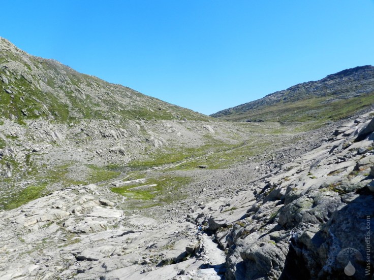 Ich setze meinen Weg fort und gelange nach einem kurzen, aber steilen Abstieg in das kleine Hochtal der Märjelenseen (2.300m). Das Tal ist im Gegensatz zum Wanderweg gut besucht. Wo die wohl alle herkommen?