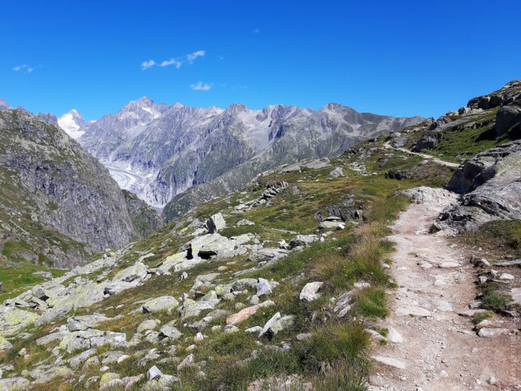 Auf den Abstieg zum Gletscherrand verzichte ich, auch wenn es mir in den Fingern juckt. Letzlich liegen aber noch fast 10 Kilometer vor mir. Ich habe keine Kraft zu vergeuden. Der nun folgende Teil der Wanderung ist so wie das Wandern nunmal ist. Hohe Berge, schmale Pfade, atemberaubende Ausblicke. Etwas, dem Großen Aletschgletscher vergleichbares fehlt.