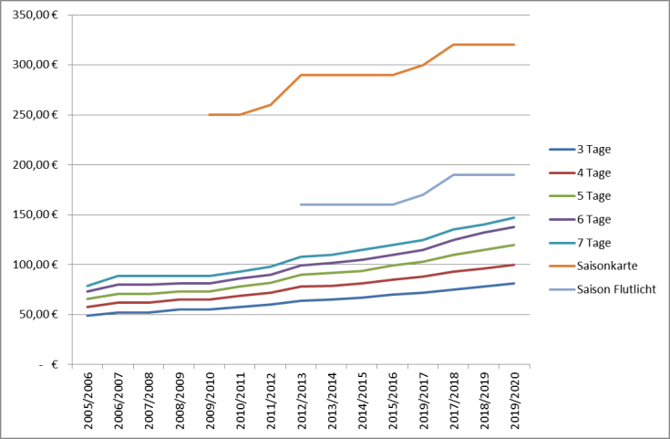 Besonders stark steigen die Kosten für die Mehrtageskarten – abgesehen vom Saisonskipass. Eigentlich absurd, da gerade die Mehrtagesgäste am meisten Geld in der Region lassen, zusätzlich Kurtaxe bezahlen und die geringste Belastung verursachen. Trotzdem hat der Gast, der am längsten bleibt, die größte Preissteigerung zu verkraften.