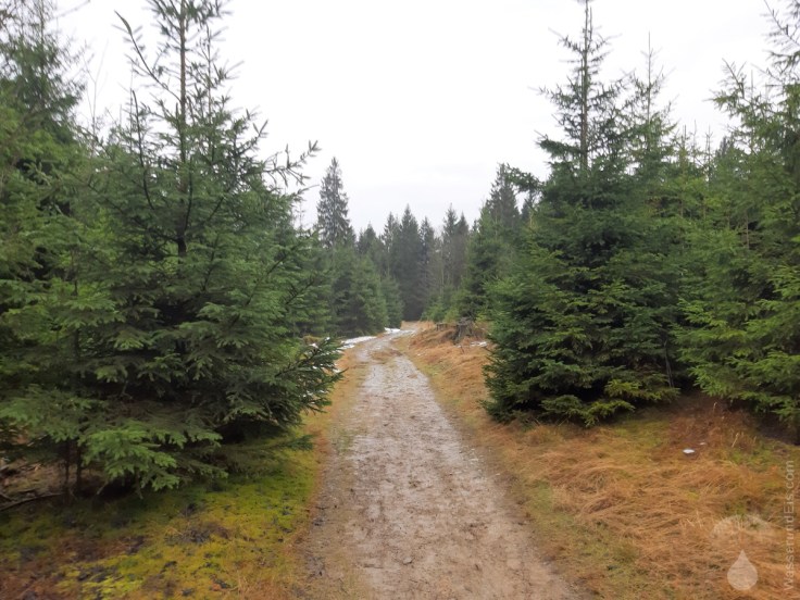Fortan wandern wir auf Forstwegen, die durch Baufäll-, eher Erntearbeiten tief zerfurcht und den andauernden Regen matschig sind. Schließlich erreichen wir nach mehreren Richtungswechseln, flachen aber langen An- und Abstiegen, den tiefsten Punkt der Wanderung am (6,8km/615m). Nun beginnt der Schlussanstieg, der uns zurück nach Schanze führt (8,8km/715m). Der Regen hat uns inzwischen völlig durchnässt und wir sind froh wieder am Auto zu sein.