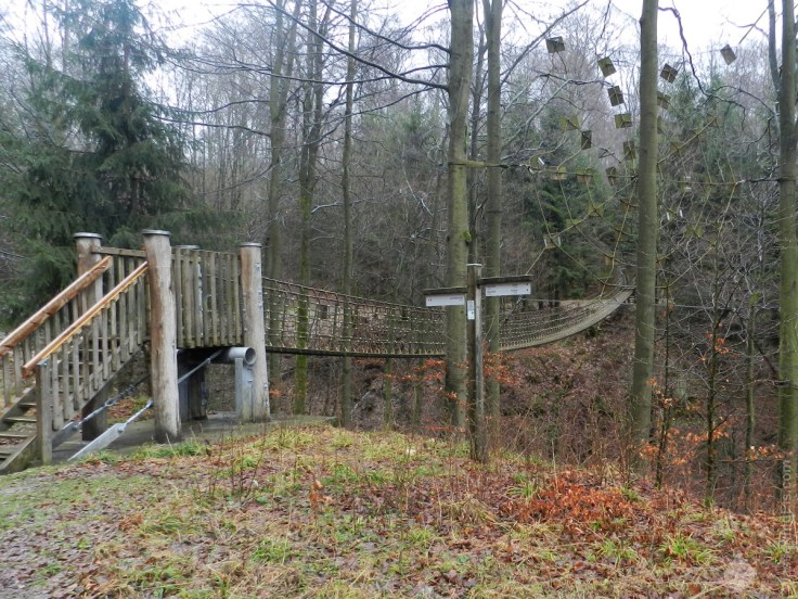 Wir beginnen unsere Wanderung mitten im Dorf (0km/715m) und wandern auf dem Waldskulpturen Weg nach Osten. Nach einer kleinen Kuppe (0,8km/740m) biegen wir rechts in den Klosterpfad ab – keine gute Idee. Der Weg ist beinahe zugewachsen und matschig und zu allem Überfluss beginnt es auch noch zu regnen. Glücklich erreichen wir bei Kühhude wieder Rothaarsteig, der hier auf einem Forstweg verläuft (2km/ 700m). Nach einem kurzen Anstieg biegen wir scharf nach Westen ab wo wir dann in die Schlucht des Hochgelmker Siepen absteigen, die mittels einer Hängebrücke gequert wird (3,5km/680m). Das Highlight dieser Wanderung.