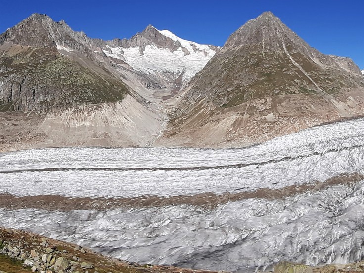 Titelbild: Der Mittelaletschgletscher vom Wanderweg unterhalb des Eggishorns aus gesehen, darüber die mächtige Südwand des Aletschhorns. Die schuttbedeckte Gletscherzunge hebt sich deutlich vom aperen, grau-blauen Gletschereis sowie den gelblich-weißen Firnflächen ab.