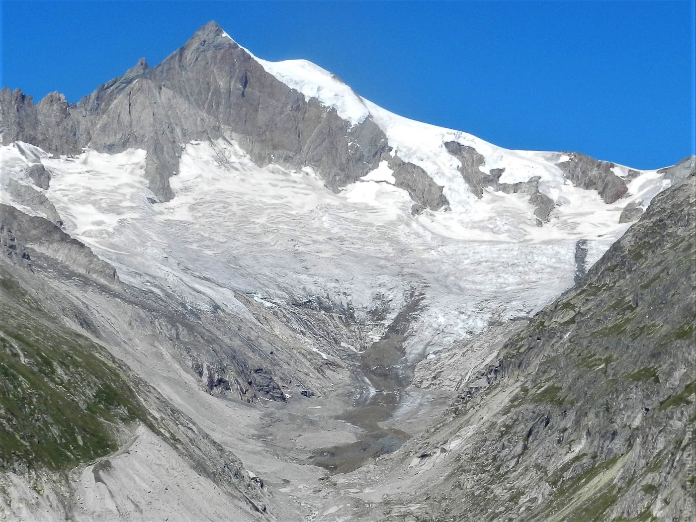 Titelbild: Der Mittelaletschgletscher vom Wanderweg unterhalb des Eggishorns aus gesehen, darüber die mächtige Südwand des Aletschhorns. Die schuttbedeckte Gletscherzunge hebt sich deutlich vom aperen, grau-blauen Gletschereis sowie den gelblich-weißen Firnflächen ab.