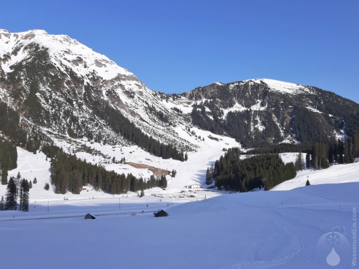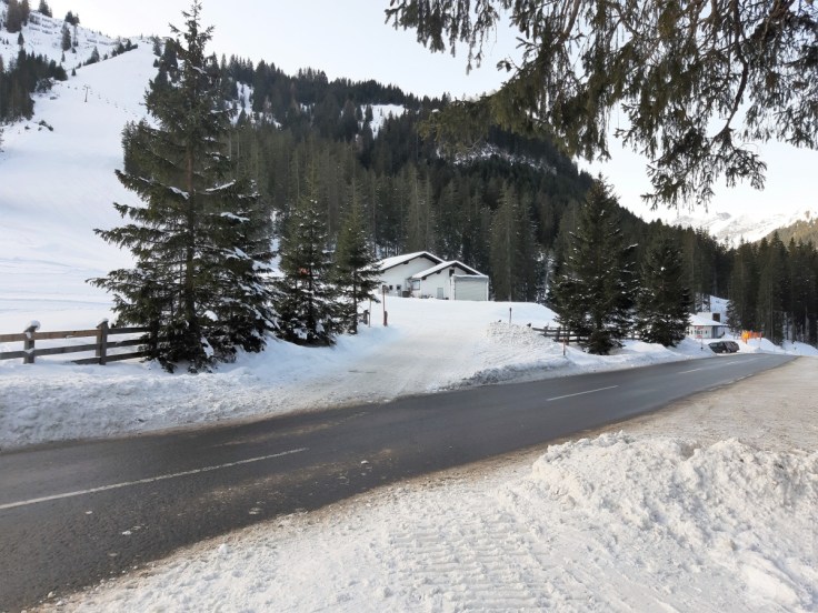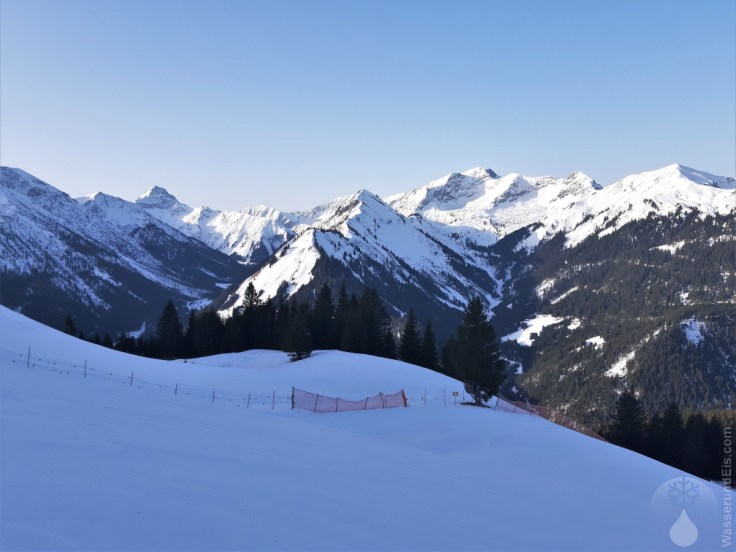 Harmlos ausgedrückt ist die Schneelage nicht gerade üppig. Unterhalb von 1000m liegt nur ein Hauch von Naturschnee, um die 5cm, Südhänge sind bis weit hinauf vom Schnee freigebrannt. Auch im Skigebiet sind nicht alle Pisten geöffnet, die Verbindung zum Ortszentrum von Bichlbach ist wegen Schneemangels gesperrt, die Naturschneehänge am Rastkopf sind teilweise steinig, auf einigen Verbindungsabfahrten schimmert der Untergrund durch.