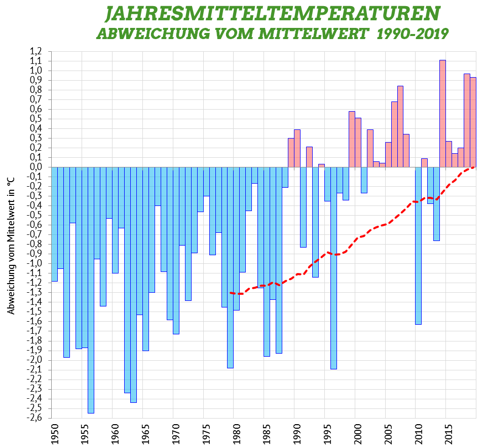 Die mittleren Jahrestemperaturen in Bremerhaven sind seit 1949 stark angestiegen. Ausgehend vom klim. Mittelwert* stiegen die Durchschnittstemperaturen der letzten 30 Jahre um 1,1°C an. Nur dreimal wurde der Jahreswert von 11°C übertroffen, 2019, 2018 und 2014 sowie vorraussichtlich auch 2020.