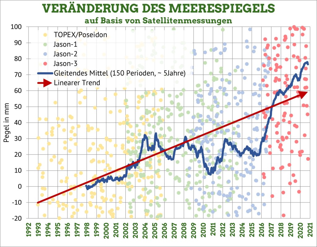 Im Zuge des Klimawandels, der globalen Erderhitzung, steigt der Wasserspiegel wieder an – und zwar deutlich. Ursache sind zum einen die schmelzenden Eisschilde in Grönland und der Antarktis, andererseits der derzeit (noch) dominierende Effekt der thermischen Ausdehnung – wärmeres Wasser nimmt mehr Raum ein als kühleres.
